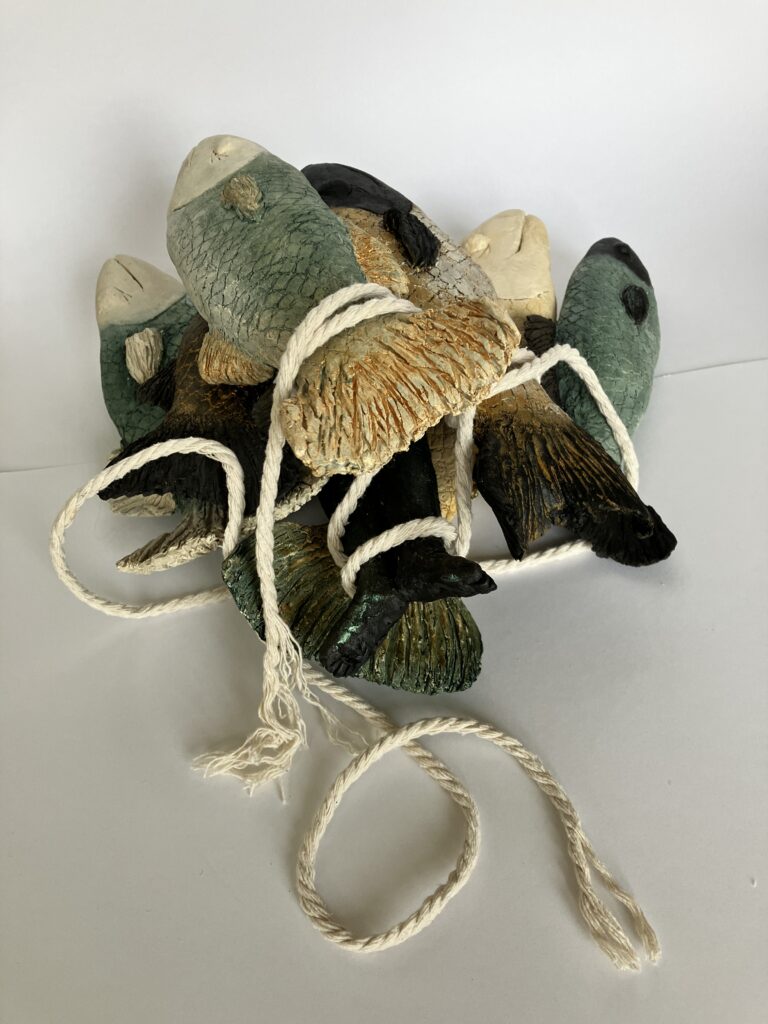 Sascha van Eijk onderzoekt hoe conserveringsmethoden – drogen, zouten, vacuüm verpakken, in het donker bewaren – functioneren als beeldtaal. Ze past ze toe op keramische vissen die die methoden helemaal niet nodig hebben.