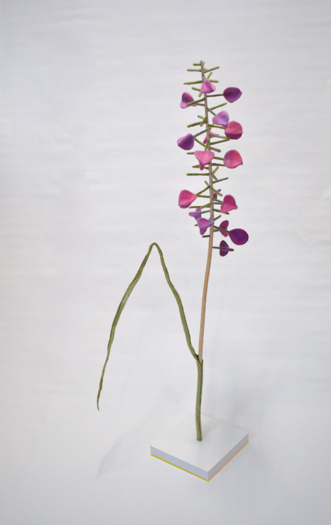 Het werk van Petra Kooij begint bij de nauwkeurige observatie van bloemen en planten. Haar botanische sculpturen, gemaakt van vilt en textiel, vaak gecombineerd met materialen zoals hout, metaal of gips. In haar werk komt de volledige levenscyclus tot uiting: van weelderige bloei tot totale verdorring en verval.
