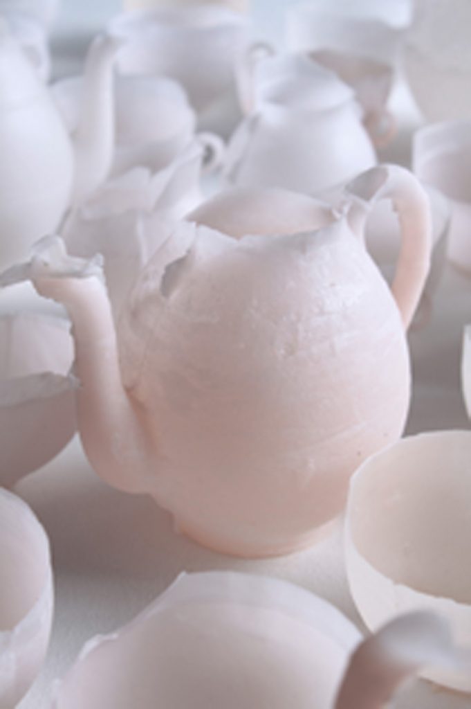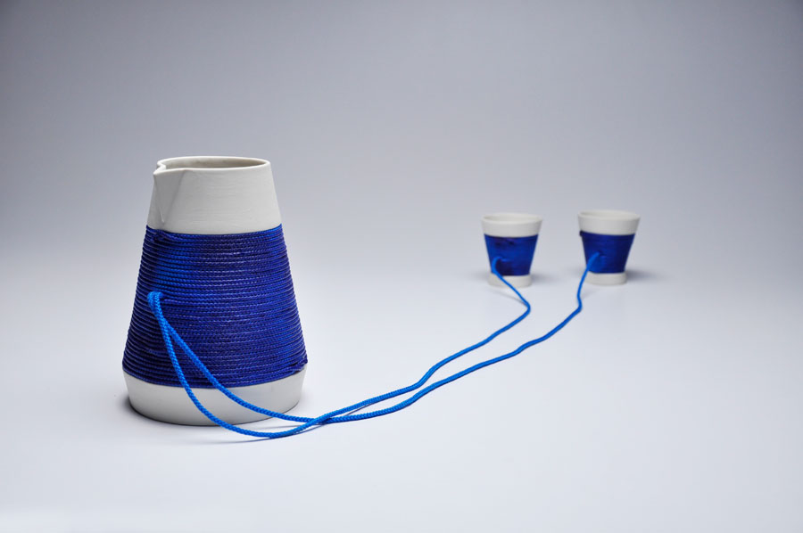 “Drinking Link” thee set is een onderzoek naar hoe wij socialiseren en delen rond de tafel. De set is geïnspireerd op traditioneel tafelgerei en bestaat uit een theepot die verbonden is met zijn kopjes. Synthetisch touw is om de voorwerpen heen gebonden en verhard door een verwarmingsproces waarbij de flexibiliteit is behouden. Met deze installatie moeten mensen binnen een bepaalde afstand van elkaar blijven, terwijl ze drinken en praten.
