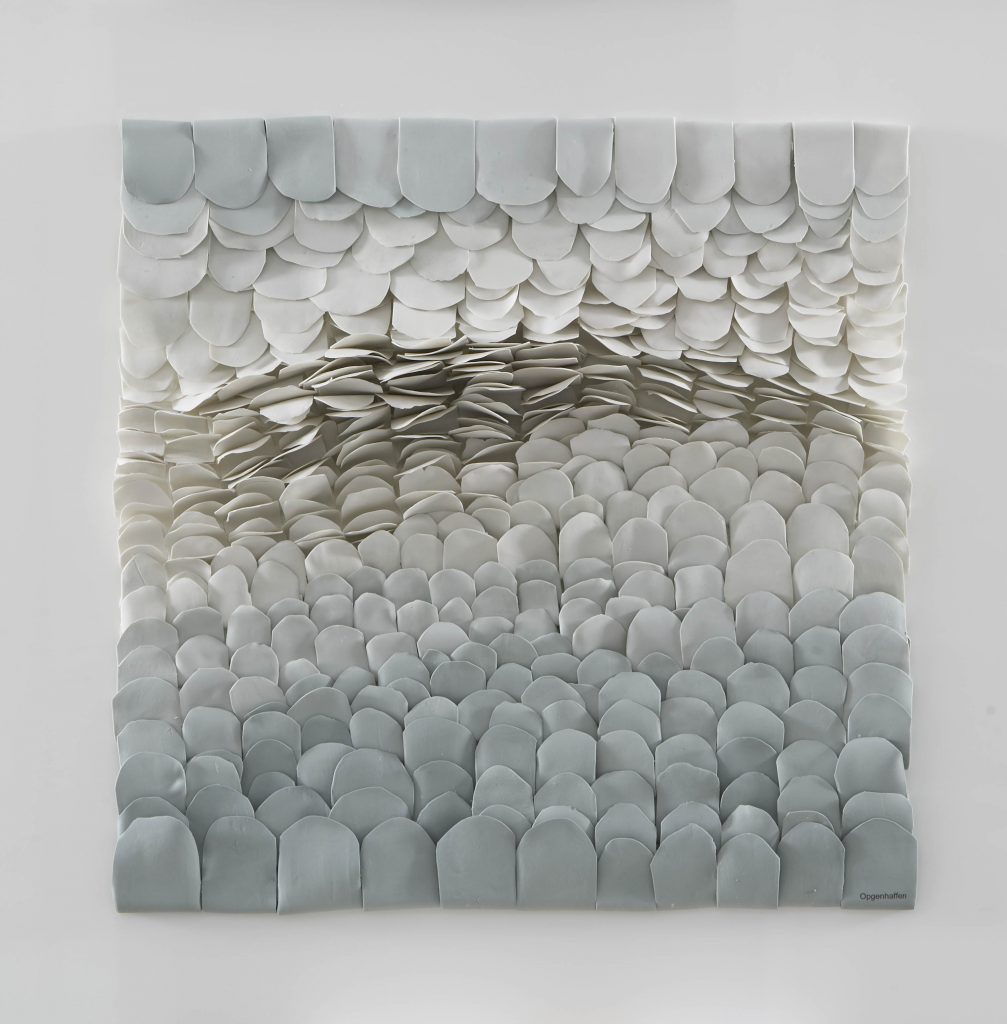 Landschappen kunnen ook uitvergroot worden. In het werk “Green” schuiven de porseleinen plaatjes als twee grote tektonische platen zacht maar beslist tegen elkaar. Je ziet de bergketen geboren worden. “