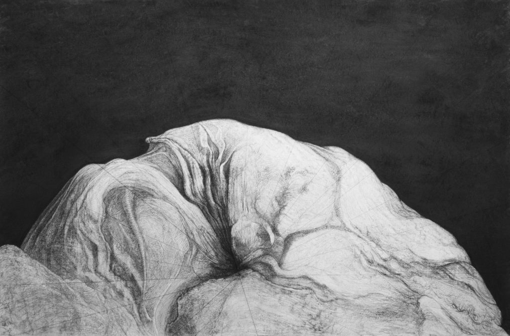 It could be said that it started this way, in the life sculpture class, led by the chance of a day-time job as an art model. Sitting on the floor, the head bowed to the stomach, I considered the folded space. This field of vision was purely composed of skin, and yet foreign, disembodied. There was also this human urge, the need to proportion the world to my vision and body. In short: there was the desire to make a landscape from the formlessness I saw. As a matter of fact, it is possible to calculate the surface of the skin of a human body, as its weight and size are known. So I started a drawing, a 1,6549 m² landscape. However proportionate, the surface felt much bigger than me. Drawing became immersive – just as posing was.